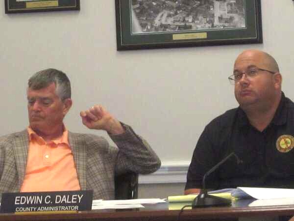 County Administrator Ed Daley, left, at staff table with Deputy Fire & Rescue Chief Gerry Maiatico. The latter weighed in on 911 emergency call logistics in road name change senarios, particularly in more remote areas of the county.