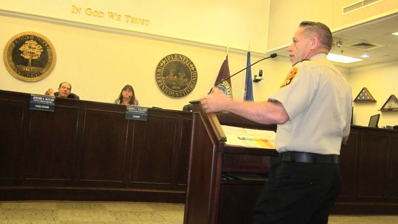 We know how at least one of these citizens feels about the proposed Bentonville Transfer Station area WCSO Training/Shooting Range site. Below, Sheriff Cline, seated far left, and F&R Chief Bonzano, standing orange folder in hand at door to right, with a number of their first responder staffs present for various portions of the work session agenda.