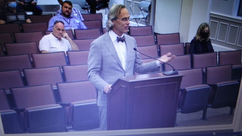 Planning Director Joe Petty, left, addresses the reasons Riverton Commons is treated differently on by-right commercial CUP permitting uses, as opposed to every other commercial space in Warren County – the short answer: an obsolete commercial uses list for the shopping center dating to 2003. Below, CUP Modification applicant attorney Stephen Pettler tells supervisors his client just wants to be treated like everybody else in Warren County commercial districts. Royal Examiner Photos by Roger Bianchini