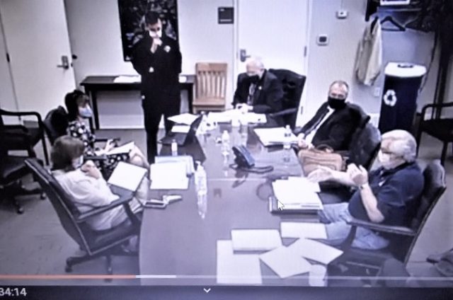 Who are those masked men & women? – County Board and Joint Coronavirus Emergency Management Team Chair Walt Mabe, hands extended bottom right, told his colleagues several councilmen’s complaints about a County relief distribution proposal appear based solely on a desire for unilateral control of a larger piece of the federal financial pie.