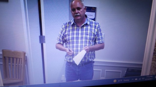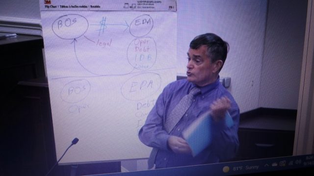 In Dec. 2019 file photo, then-Mayor Gene Tewalt at an EDA Board meeting. Tewalt urged Town Council to accept EDA-offered negotiations to determine exactly what the Town’s losses in the EDA financial scandal were – but council wasn’t listening. Will they now? Then EDA Board Chairman Ed Daley is at far left, flanked by Greg Harold, Doug Parsons, Jeff Browne, standing, a partially obscured Gray Blanton, and Jorie Martin. Now Supervisors Chair Cheryl Cullers is seated behind Mayor Tewalt.