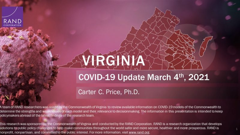 On March 5, County Emergency Services Coordinator Rick Farrall distributed the following State-sponsored RAND Corporation PowerPoint presentation on COVID-19 Coronavirus trends in Virginia, with comparative information from surrounding states and the nation, as relevant.