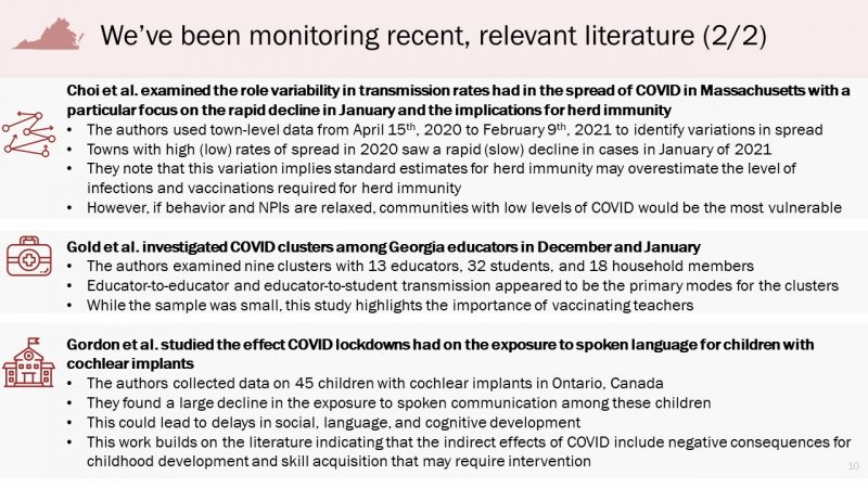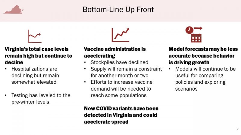 As noted on its opening page, “The information in this presentation is intended to keep policymakers abreast of the latest findings of the research team”. Included is information, not only on case, fatality, and hospitalization trends but vaccination distribution and anticipated availability issues.