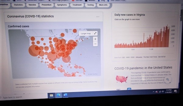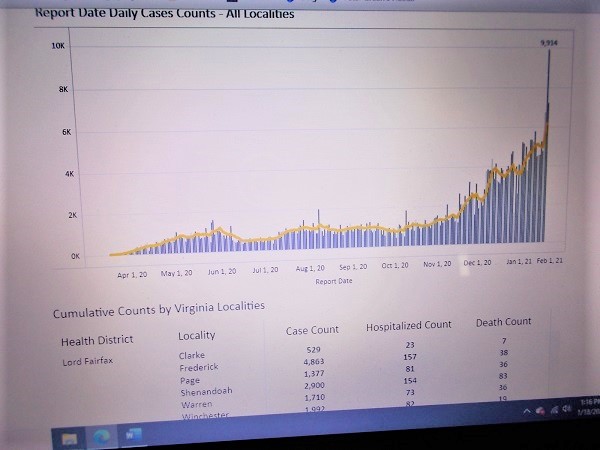 As of midday Friday, January 15, County Emergency Management Deputy Director Rick Farrall released the latest COVID-19 novel Coronavirus pandemic statistics for Warren County, the Lord Fairfax Health District of which we are a part, as well as state and national numbers. In the two weeks since our last published report of December 30, Warren County reported 312 new cases (to 1,633 from 1,321) and saw its deaths rise by 3 to 36. Seventy-one county citizens had been hospitalized with the virus over the nearly a year it has been reported on our shore.