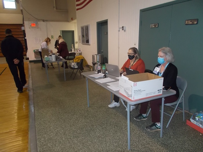 Check in is in distance, check out in foreground, as volunteers and Valley Health personnel combine to make the vaccination process as safe, comfortable and efficient as possible.