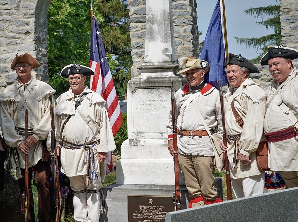 The Fort Loudoun DAR Regent Susan Lauren emcee’d the event with Melissa Clevenger providing chaplain duties. During the dedication, Alexandra Collins, Lawrence Augustine Washington Society, Children of the American Revolution unveiled the marker. Wreaths were presented by Susan Lauren, Fort Loudoun DAR; Alexandra Collins, Lawrence Augustine Washington, C.A.R.; Peter Davenport, Mid Atlantic District, SAR; and Thomas “Chip” Daniel, Col James Wood II, SAR. A three round musket salute was fired by the SAR musket squad. The Virginia State SAR Color Guard was commanded by Marc Robinson and included Brian Bayliss, Sean Carrigan, Paul Christensen, Dale Corey, Thomas “Chip” Daniel, Allan Phillips and Will Reynolds (CJWII); Peter Davenport (George Mason); and Warner Workman (Sgt Maj John Champe).