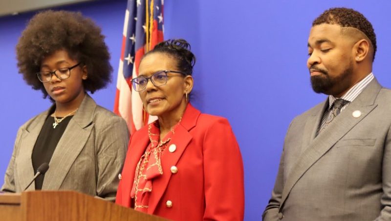 Del. Jeion Ward, D-Hampton, addresses members of the media in Richmond on Jan. 22, 2025. At right is Del. Joshua Cole, D-Fredericksburg. (Photo by Nathaniel Cline/Virginia Mercury)