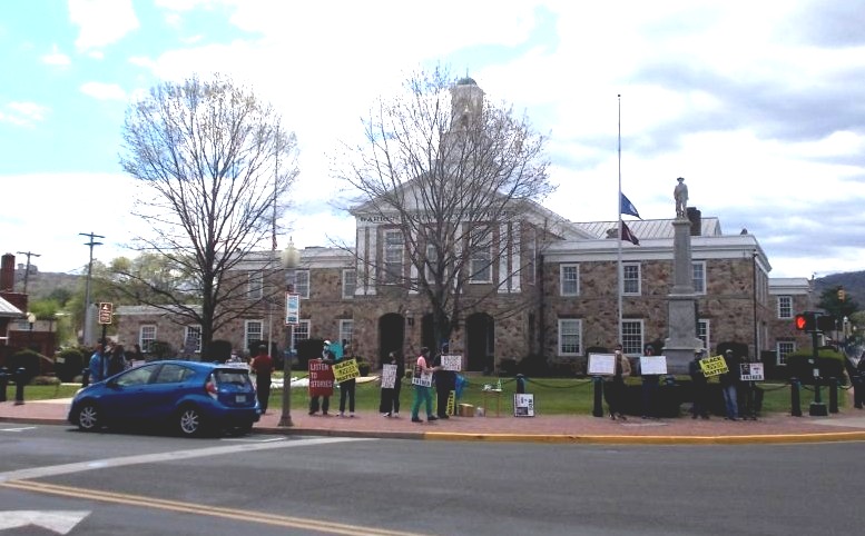 Royal Examiner spoke to event organizer Laura Cascada of Northern Shenandoah Valley Unites about the message approximately 25 sign-bearing people gathered to make at noon on Saturday, April 17, in front of the Warren County Courthouse grounds. Cascada explained that while the presence of the Confederate soldier’s statue at the courthouse remains an organizational concern, equal justice and treatment under the law was the focus of Saturday’s peaceful demonstration, not statues.