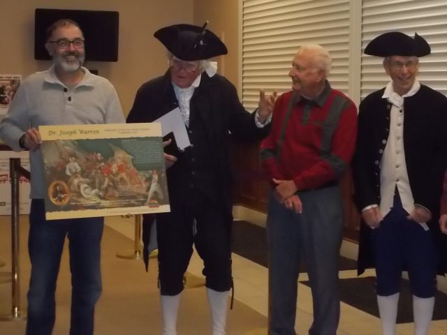 Above, now-Mayor Holloway, left, along with then-Mayor Tewalt, gets some consultation from Revolutionary War reenactors during late 2019 hanging of memorial plaque in honor of Gen. Joseph Warren for whom the county is named. Hopefully, the war of words surrounding Sheriff Butler’s handling of questions about what was being dumped by the Town at the Bentonville Transfer Station won’t escalate into a reenactment of the war that ended Joseph Warren’s life, as portrayed in the memorial art.
