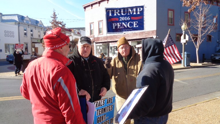 The Wallers continued to sport the original Trump-Pence campaign sign they displayed in March after first Sherp alone on March 8, and then supporters appeared across the street at the Front Royal Town Gazebo. And this week Ralph added one sign reflecting the religious tone of the newer pro-Trump contingent negatively portraying liberals as “DESTRUCTORS OF GOOD GODLY MORAL ORDER” and “TERMITES IN GOVT”. If anything, that sign reflects the astonishingly-wide gap in perspectives of pro and anti-Trump citizens of this town and nation.