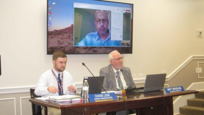 Remotely connected Shenandoah District Supervisor John Stanmeyer looms over the shoulders of Planning and Zoning staff members Chase Lenz and Matt Wendling as the Public Hearing on the Agritourism permitting initiative became increasingly critical.