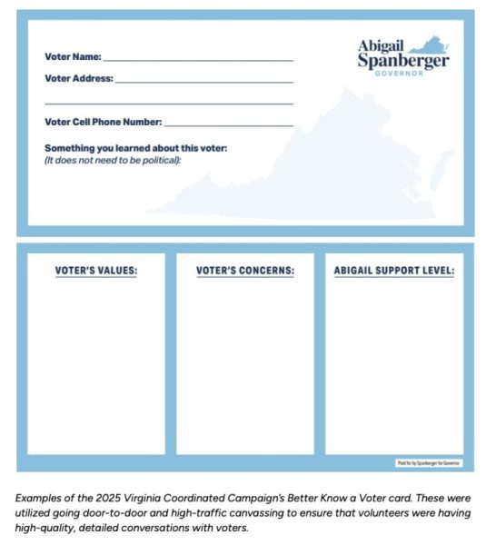 A tactic deployed in Spanberger’s gubernatorial campaign entailed using a rubric to help volunteers and campaign staff better relay what they were hearing from voters when door-knocking or interacting at events.