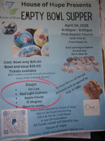 Royal Examiner was alerted to an April 4th preparation for the annual “Empty Bowl Supper” fundraiser for the House of Hope, homeless men’s shelter. That fundraising supper is scheduled for April 24, from 6 p.m. to 8 p.m. at the First Baptist Church at 14 West First Street in Front Royal.
