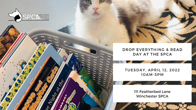 The Winchester SPCA Paws & Pages Program invites readers of all ages to stop by the adoption center on Tuesday, April 12th, between 10AM and 5PM, to celebrate this day by reading to a shelter pet. Books and cushions are provided by the animal shelter (or bring your own).