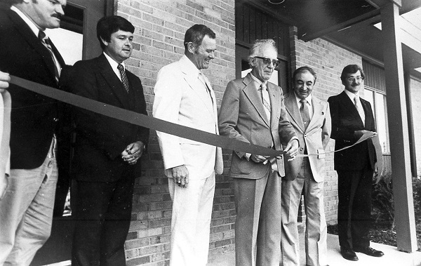 Stephens City Municipal Building ribbon cutting. L to R: State Delegate Andy Guest, Councilman Dale Barley, Congressman J. Kenneth Robinson (key note speaker), Mayor Lynn Comer, State Senator Bill Truban and Building Committee Member James Golladay Jr. on September 9 1979. Courtesy Scott Mason, Stewart Bell Jr. Archives, Handley Regional Library.