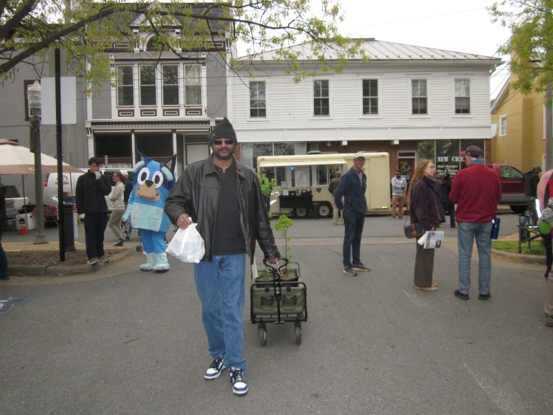 “This was an awesome grant from the Department of Forestry. It was funded through their Virginia Trees for Clean Water Program. So, it was a $7,000 grant and we bought these trees and we’re giving them away to the community during our Front Royal Earth Day, Lone Pine Day Festival. And they’re all gone,” Rademacher observed shortly after 11 a.m. before we noted three lonely trees sitting somewhat obscured at some distance behind his table and over toward East Main Street.