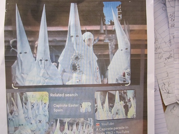 Photo provided by Stevi Hubbard of the referenced hooded (Capirote) uniforms once more commonly donned by European Catholics, particularly in Spanish areas, as part of an Easter season repentance ritual dating back as far as the Inquisition era.