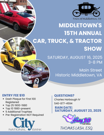 Get ready, gearheads! The 15th Annual Middletown Car, Truck & Tractor Show roars into town this Saturday, August 16, 2025, bringing with it the largest display of automotive, truck, and tractor excellence in the Shenandoah Valley. This beloved event draws up to 400 vehicles from across the region for a full day of classic charm, chrome, and community spirit. The show is proudly sponsored by City National Bank, Hang 10 Car Wash, and Thomas Lash, Esquire.
