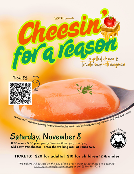 Join WATTS in Cheesin’ for a Reason! Named in honor of one of our guests’ favorite meals, you’ll enjoy a fun day for the whole family, tasting/sampling a variety of twists on the classic comfort food combo of grilled cheese & tomato soup, voting for your favorites, and helping raise funds for a great cause ♥ There will be a kids zone with a variety of free activities (included with your ticket purchase) as well as vendors at which to shop and live music throughout the day, centrally located near the Civil War Museum. We’ll also be doing a scavenger hunt challenge – spot them all for a chance to win a prize! Commemorative event t-shirts and merch will be for sale and don’t miss the 50/50 raffle and more. A memorable and mouth-watering event that promises to be a lively fun community day for all, we hope you’ll join us and come together to make an incredible impact for adults experiencing homelessness in our community. THANK YOU for helping make a difference in the lives of those who need it the most!