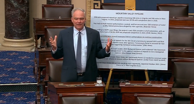 Kaine issued a statement shortly after the vote saying that “like so many Virginians, I’m relieved we defeated the attempt to greenlight the Mountain Valley Pipeline without normal administrative and judicial review. Now we can move on and fulfill our responsibility to fund the government.”