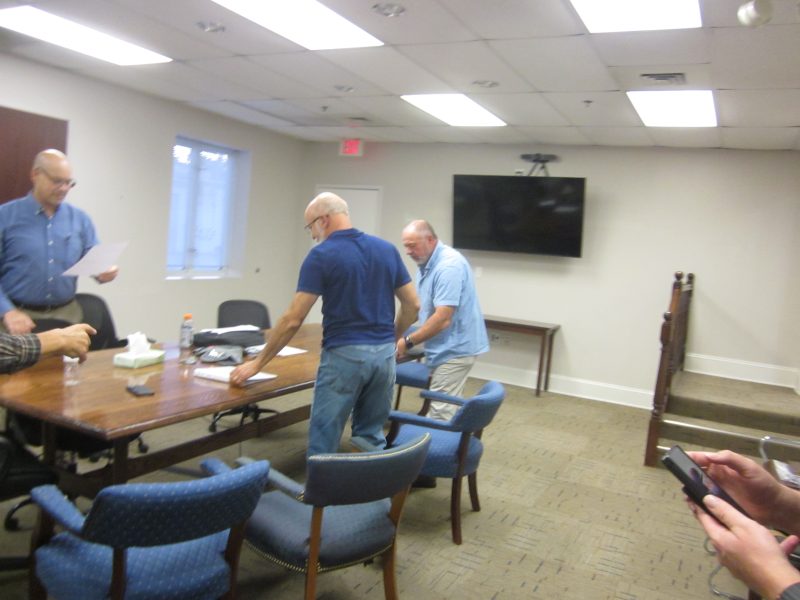 Circuit Court Clerk Angie Moore swears in Hugh Henry during a brief recess in the supervisors’ Special Meeting following Chairman “Jay” Butler’s announcement of the appointment decision. Below, Hugh Henry and Paul Barnhart are awaiting the end of the Closed Session during Amber Martin’s interview for the planning commission seat soon to be vacated by Henry. Royal Examiner Photos Roger Bianchini