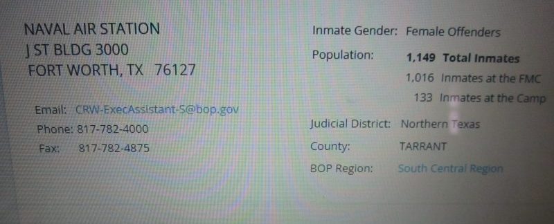 In blue text, the first change in the Inmate Locator status of Jennifer Rae McDonald since her May 29 sentencing with a court order “not to report before June 24”. Below is an image and stats on the Federal Medical Center Carswell and its adjacent satellite prison camp in Forth Worth, Texas. – Photos from the BOP website