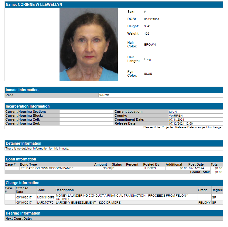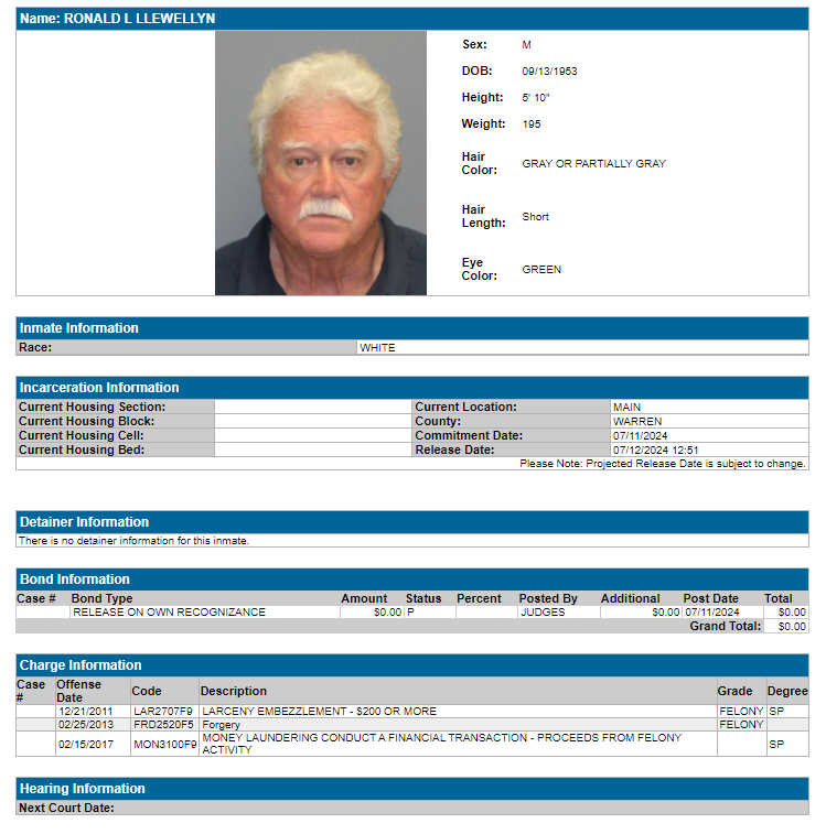 Files from Frederick County’s Northwestern Regional Adult Detention Center website indicate the Thursday, July 11, arrest and subsequent release on their own recognizance the following day of former Warren County Supervisor and FR-WC EDA Board of Directors member Ron Llewellyn and his wife, Corinne. Charges against the couple brought by direct indictment out of Warren County include Larceny Embezzlement (over $200 felony); Money Laundering – Conduct a Financial Transaction with Proceeds from Felony Activity. Ron has also been charged with forgery regarding the allegations.