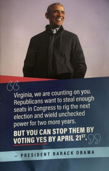 “Virginia, we are counting on you,” Obama is quoted in the mailer. “Republicans want to steal enough seats in Congress to rig the next election and wield unchecked power for two more years. But you can stop them by voting yes by April 21.”