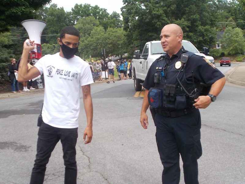 FRPD Chief Magalis discusses march logistics with FR Unites organizer Samuel Porter. Royal Examiner Photos/Roger Bianchini – Royal Examiner Video/Mike McCool