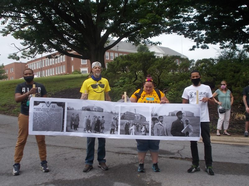 Front Royal Unites organizers Samuel Porter and Stevi Hubbard introduced two ministers to launch the March for Justice. One of those was a black student involved in that late ‘60’s struggle against Virginia’s “Massive Resistance” movement in Warren County, the Reverend James Kilby. Kilby acknowledged that historical battle launched by his father, against a backdrop of photos of the eventual integration of WCHS and all public schools in Warren County, Virginia, and the nation.