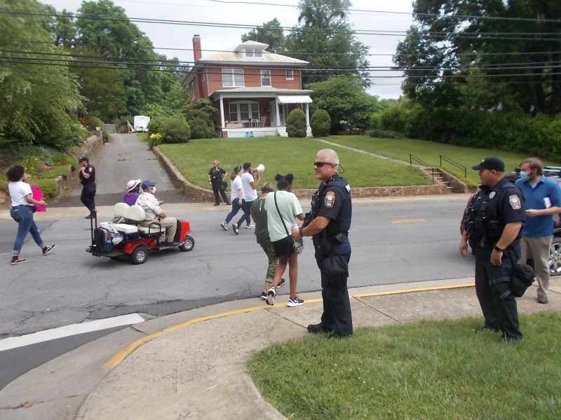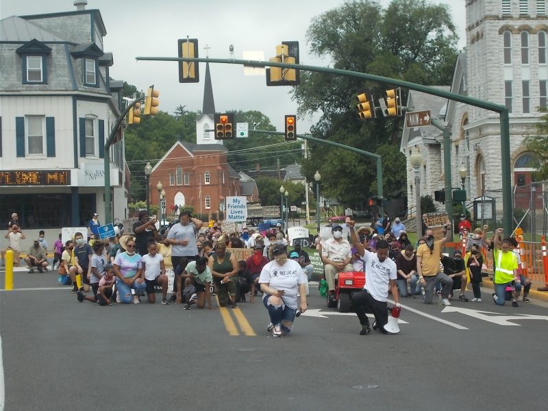 Above, with Porter and Stevi Hubbard in the lead, a carted Rev. Kilby and his sister lead the march as it turns onto Luray Ave. Below, organizers and the crowd kneel in prayer as the ‘March for Justice’ arrives at E. Main St. and fronts the WC Courthouse.