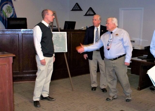 Warren County Board Chairman and impacted North River District Supervisor Dan Murray offers a friendly hand to Assistant Frederick County Administrator Jay Tibbs as Opequon District Supervisor Robert Wells watches. Photos/Roger Bianchini