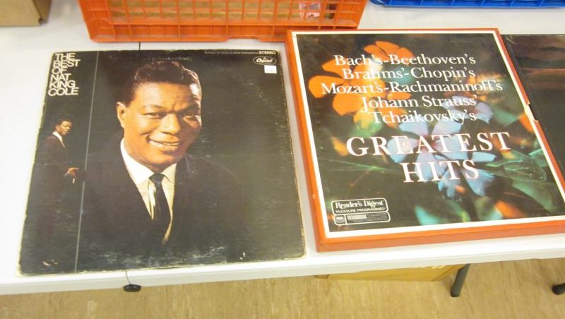 And a final look at objects on display for purchase before checking out, including vinyl Pop classics from multiple eras from Huey Lewis and the News to Led Zeppelin to Joni Mitchell, The Beatles, and Nat King Cole, and an interstellar array of Classical Music composers.