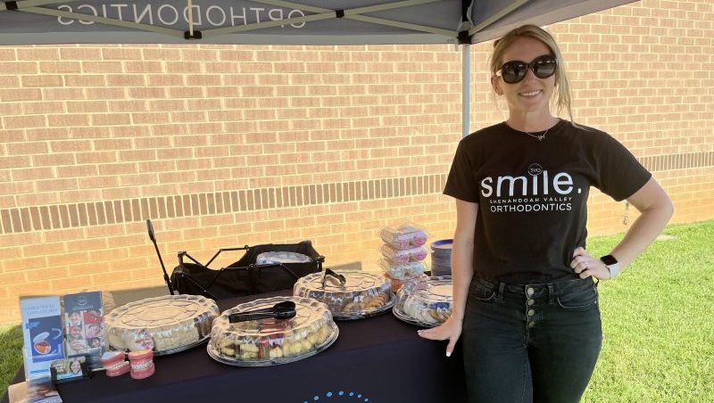 Shenandoah Valley Orthodontics, represented here by Abbey Rodriguez, is a friendly presence at the school picnic, sponsoring the event and providing delicious desserts.