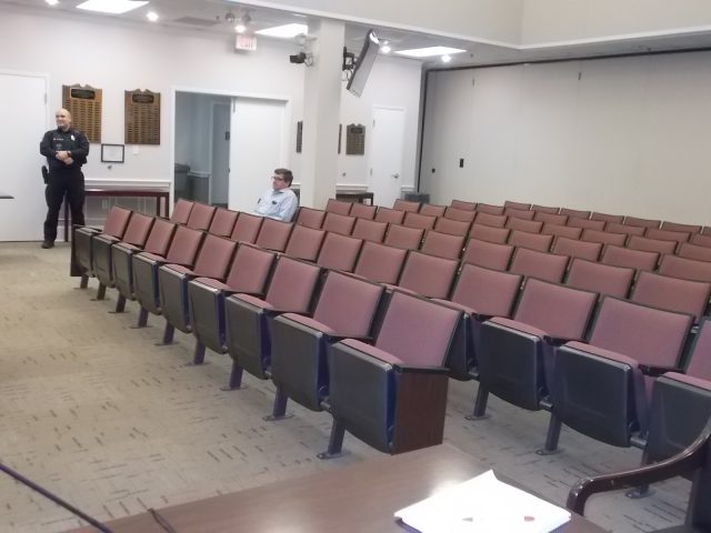 Above, Chief Magalis, flanked by the socially-distanced interim town manager, oversees an empty house as the meeting was about to convene; below, one citizen, former councilman, and former supervisor’s arrival took the number present, including Royal Examiner’s two-pronged media presence, from 10 to 11 – don’t tell the governor.