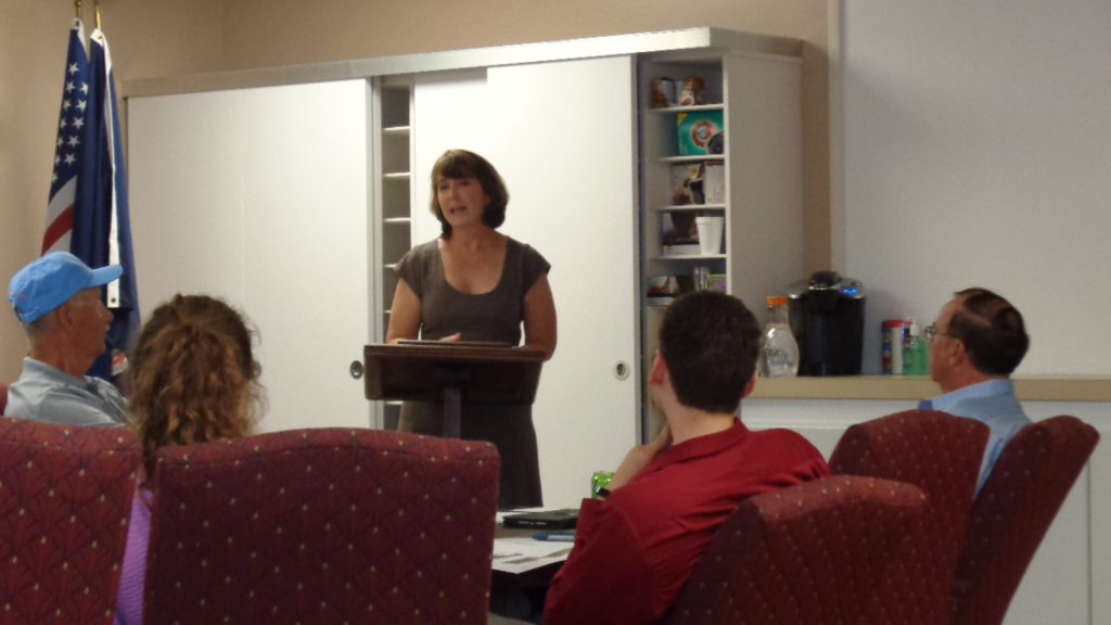 Mrs. Tim Barnhart, partner with her husband in Vibe Properties, explains redevelopment plans for commercial property in heart of historic downtown Front Royal. Photo/Roger Bianchini