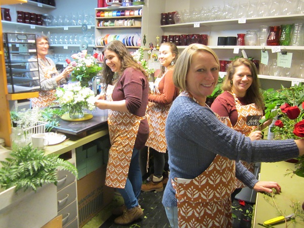 The newest generation of the Fussell Florists ‘family’ at work filling Valentine’s Day orders. Below, that ‘family’ poses outside at the 2nd Street entrance off the Warren County Government Center’s south-side parking lot entrance; to left in final photo below.