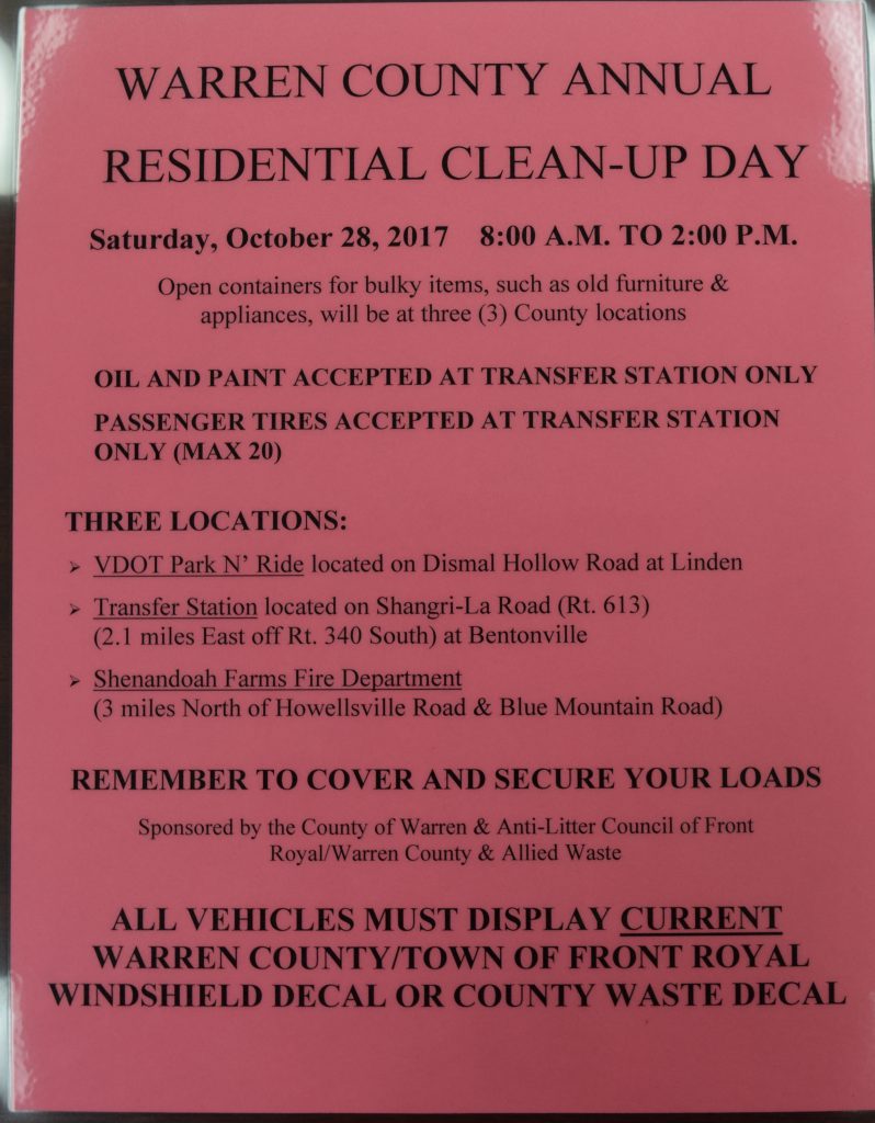 Be sure to mark your calendars for this important day in Front Royal/Warren County!  Clean up your backyard, basement or just help around town. Take advantage of the lifted limit regulations on items like paint and tire (max 20) disposal. Dispose bulky items free of charge. There will be three locations participating this year for residential clean-up day: