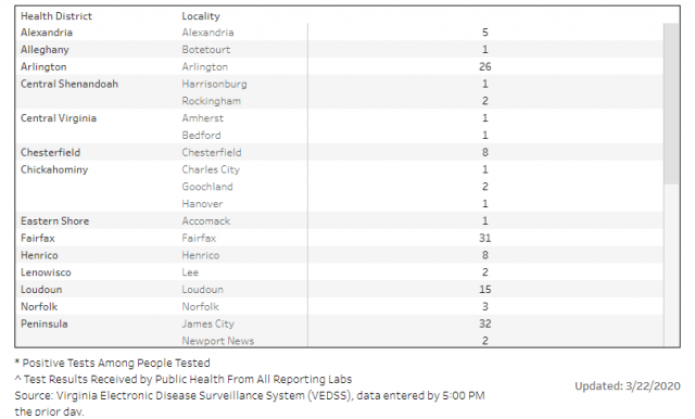 Local News Governor Northam updates Virginians on COVID-19 – March 22 Published 6 years ago on March 22, 2020 By Royal Examiner Here’s the Governor’s COVID-19 update for Sunday, March 22, 2020. Since yesterday, 67 more people in Virginia have tested positive for the COVID-19 virus. Related Topics:COVID-19Governor Ralph Northam Up Next All Town offices are closed to the public effective immediately Don't Miss Lord Fairfax Health District identifies first local COVID-19 case; works to identify and notify contacts Front Royal, VA41°Sunny / Wind7:25 am4:54 pm ESTFeels like: 32°FWind: 20mph WHumidity: 42%Pressure: 29.81"HgUV index: 0SatSunMon48°F / 37°F52°F / 21°F45°F / 34°F