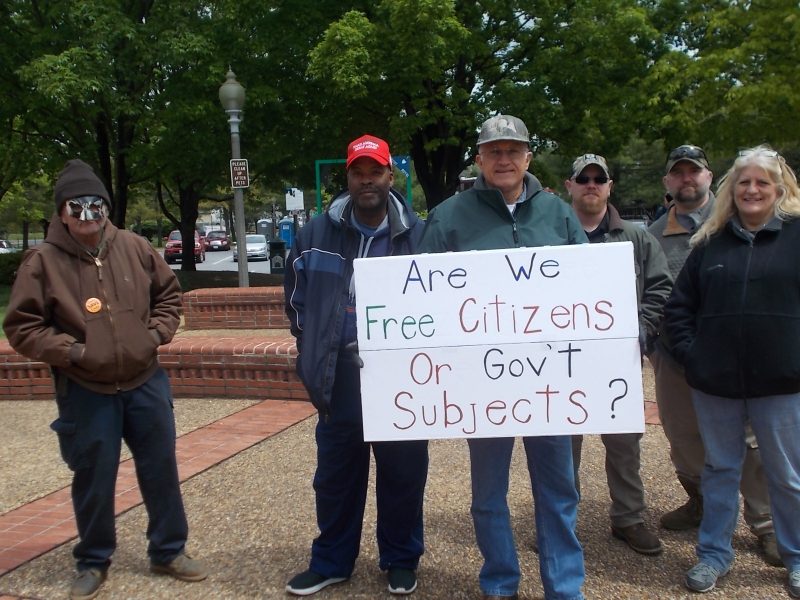 Gary Kushner with a sign, surrounded by ‘Open WC & VA’ demonstration participants on Saturday afternoon at the Gazebo/Commons area.