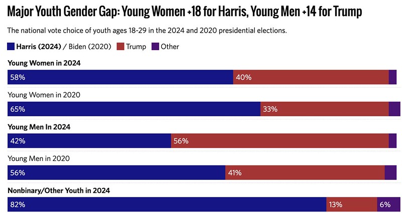 Trump gained a 10-point increase in support from younger voters, according to CIRCLE. Preliminary exit polling indicates that 56% of men ages 18 to 29 voted for Trump in November. He gained support from women, with 40% of their vote, up from 33% in the 2020 election within the same age group, according to CIRCLE.