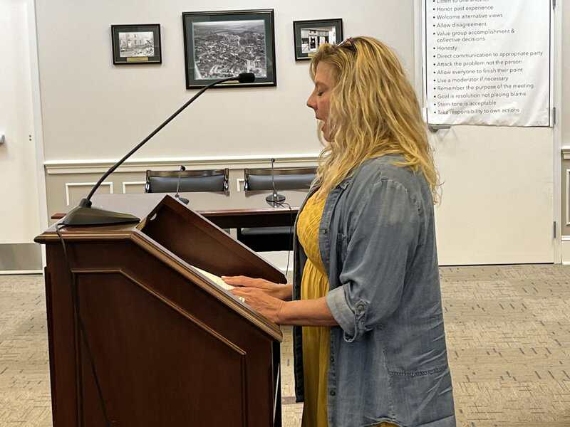 Julie Vaught, on behalf of Happy Creek Antiques, speaks in favor of a special use permit to establish a farmer’s market at the shop’s location on Commerce Avenue.