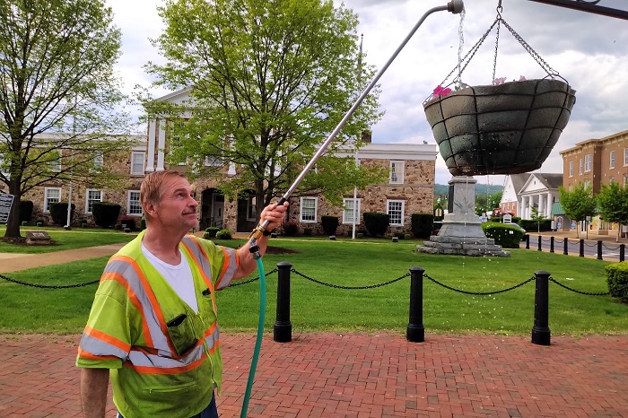 John McDonald, senior maintenance worker for the Front Royal Horticulture Division, tends to the Town’s newly hung, award-winning flower baskets. Photo by Royal Examiner Publisher, Mike McCool.