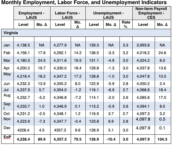 BLS publishes an additional employment figure from its Current Employment Statistics Survey (“CES” or “establishment survey”). Virginia CES employment edged up by 100 jobs in December to 4,097,900.