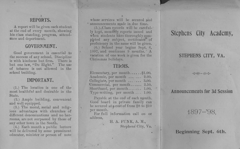 Stephens City Academy brochure for 1897-1898 school year.
