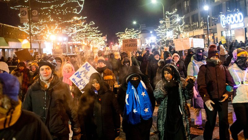 Hundreds gather around a growing memorial site at 26th Street and Nicollet Avenue South in Minneapolis, where federal agents shot and killed Alex Pretti Saturday, Jan. 24, 2026 earlier in the day. (Photo by Nicole Neri/Minnesota Reformer)