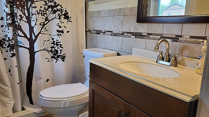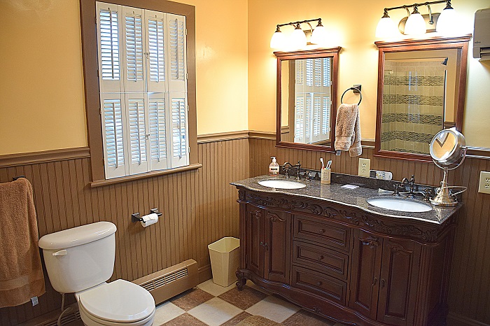 - BATHROOMS – All bathrooms have been remodeled including ceramic tile and granite. There is a full bathroom on the main level in the library. It can be used by the main level bedroom (once was the parlor and can be converted back). Half bath on the main level has a fun green sink with laundry room convenience.