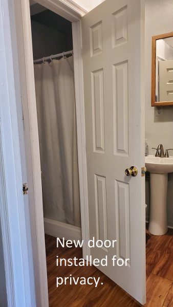 The home now has brand new wood flooring! It looks absolutely amazing. The men also now have a new door installed in the shower stall/bathroom space. If you look at the before and after pictures you will see how necessary these improvements were. Drywall work, kitchen storage solutions and paint, have created a much cozier vibe in the House of Hope.