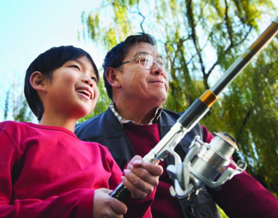 Pack snacks, drinks and safety equipment for all fishers. Dress them in layers so they can remove clothes if they get hot, and bring an extra sweater in case they get cold. Don’t forget the bug spray and sunscreen.