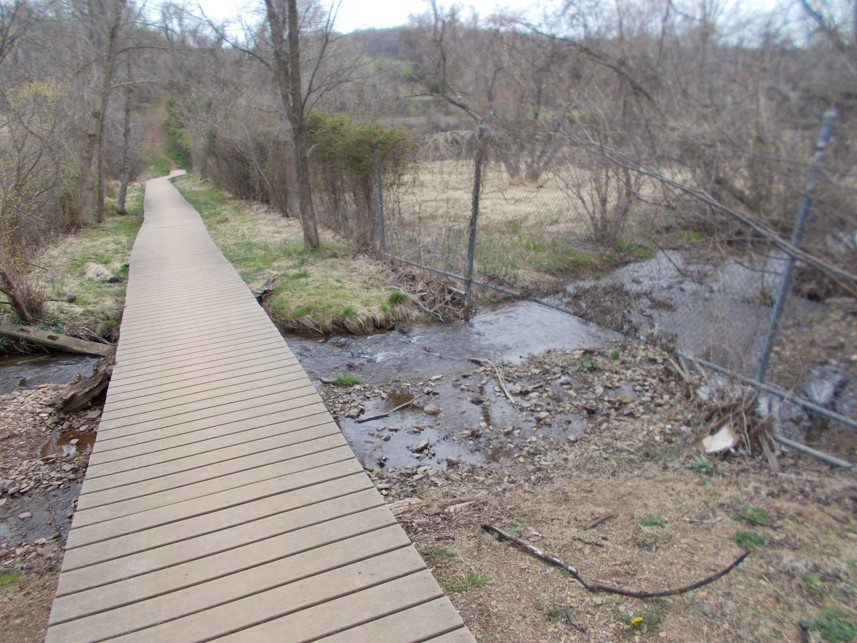 The trail-head boundary with the SCBI property is marked by a barbed-wire fence, to right looking west in this photo.